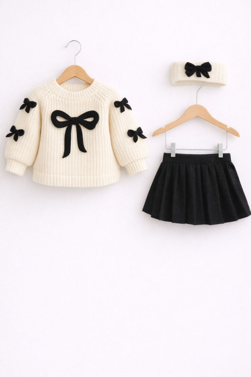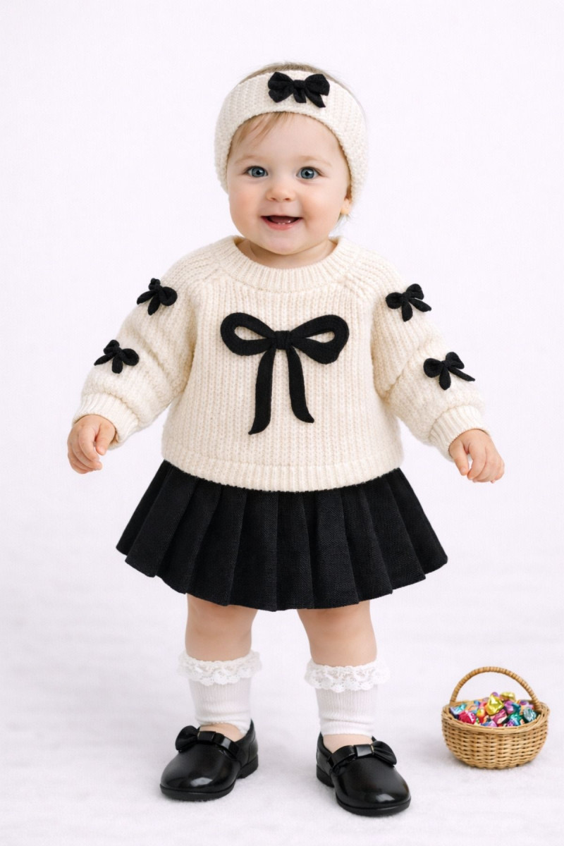 🧶 MinyTrendy – Kız Bebek Bayramlık Triko Kazak Etek Bandana Takım