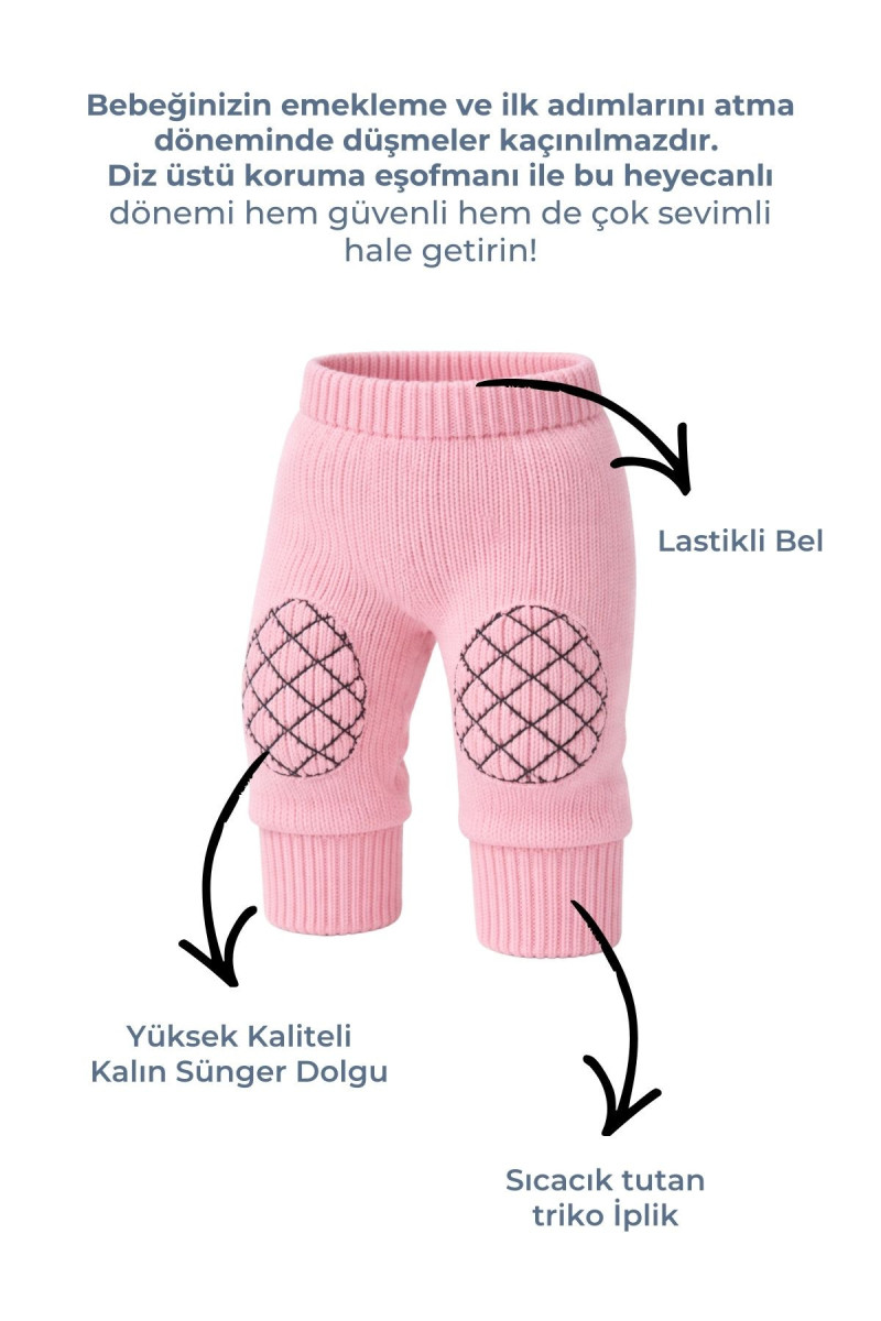 MinyTrendy – 6–18 Ay Triko Emekleme Pantolonu (Kız/Erkek) | Diz Korumalı Bebek Dizlikli Pantolon Ürün Tanıtımı MinyTrendy’nin emekleme dönemine özel tasarlanan triko emekleme pantolonu, 6–18 ay arası kız ve erkek bebeklerin dizlerini koruyarak güvenle hareket etmelerini sağlar.; Diz bölgesinde yer alan özel tasarım kalın sünger destek, sert zeminlerde darbe ve sürtünmeyi azaltmaya yardımcı olur.; Esnek triko yapısı bebeğin doğal hareketlerini kısıtlamaz; emekleme, diz üstü oyunlar ve ilk adımlar için idealdir.; ✨ Ürün Özellikleri Koruma: Diz kısmında kalın sünger destekli özel tasarım koruyucu dizlik Kumaş/Doku: Yumuşak triko – esnek, nefes alır, kaşındırmaz Kalıp: Rahat kesim; hareket özgürlüğü sunar Bel & Paça: Esnek bel bandı, ribana paça – kayma yapmaz Cinsiyet: Unisex – kız & erkek bebek/çocuk Yaş Aralığı: 6–18 ay Kullanım: Emekleme dönemi, ev içi oyunlar, park/kreş 🎁 Kullanım Alanı & Bakım Kullanım: Emekleme ve diz üstü oyunlarda diz koruması, günlük rahat kombin Yıkama/Ütü: 30 °C hassas program; tersinden yıkayınız.; Düşük ısıda ütüleyiniz.; Bakım Notu: Sünger dizlik yapısını korumak için ağartıcı ve kurutucu kullanmayınız; düz zeminde kurutmanız önerilir.; emekleme pantolonu · bebek dizlikli pantolon · koruyucu dizlik bebek · triko bebek pantolon · 6 18 ay bebek dizliği · unisex bebek kıyafeti